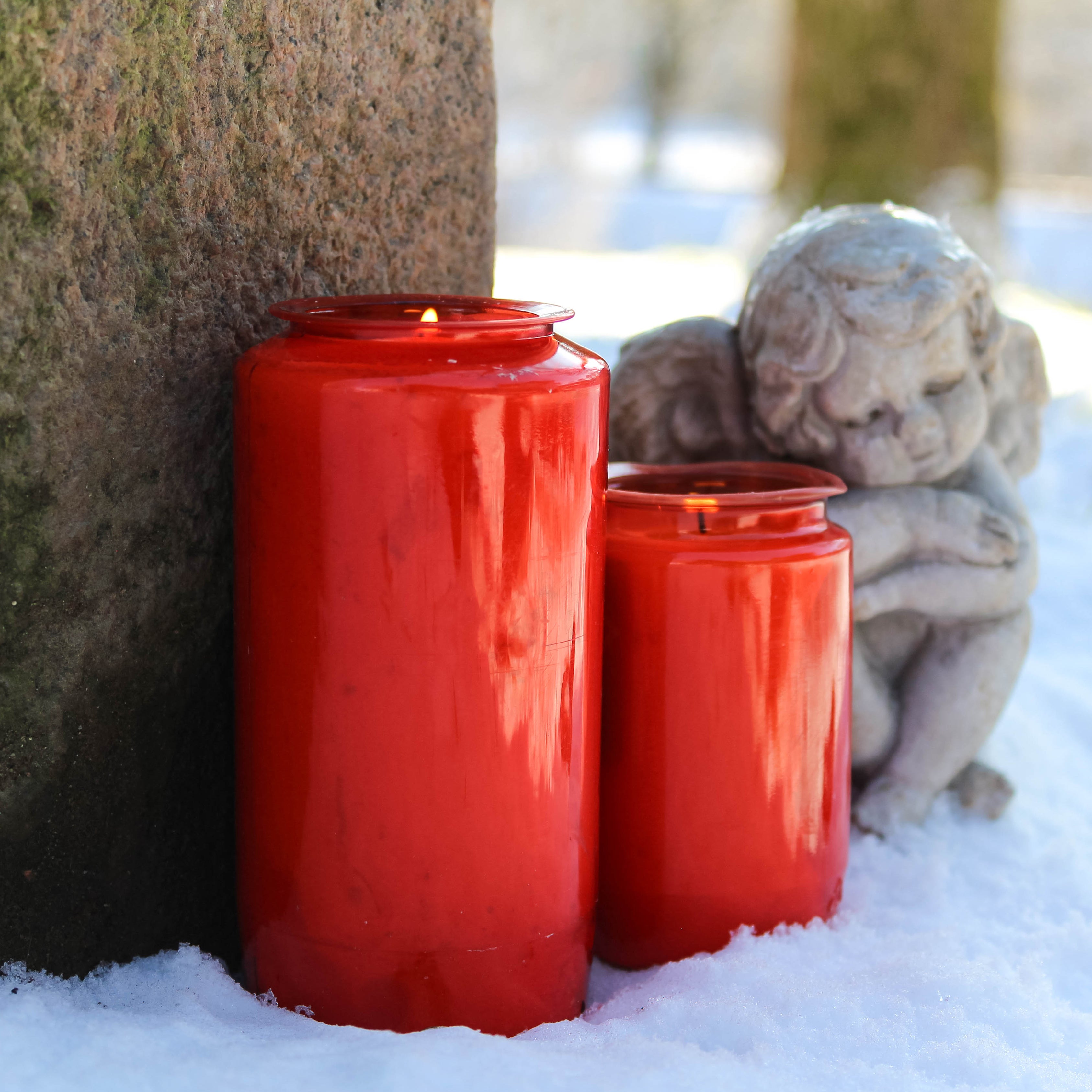 -Darauf achten, dass die Grabkerze gerade und stabil steht. Eine schiefe Position oder ein gekippter Docht kann die Kerzenhülle beschädigen und zu auslaufendem Wachs führen.