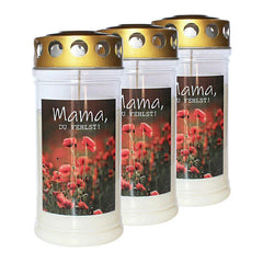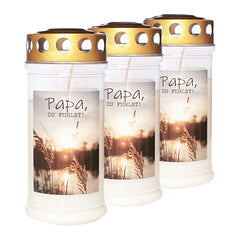 Diese hochwertigen JEKA-Motivkerzen „Papa“ mit Thermo-Doppeldeckel haben mit ihrem schönen und ausdrucksstarken Motiv eine große symbolische Bedeutung und eignen sich für alle Arten von Grabstätten als zusätzliches Gestaltungselement. Sie haben einen Ölgehalt von 100% und brennen geruchsneutral und gleichmäßig sauber ab. Der Ausbrand ist auch bei niedrigen Temperaturen sehr gut. Sie haben einen Durchmesser von ca. 75 mm und eine Höhe von ca. 170 mm. Als Witterungsschutz dient eine Kombination aus Innen- und Außendeckel. Die Brenndauer pro Motivlicht beträgt bis zu 4 Tage. Eine Verpackungseinheit enthält 3 Stück.