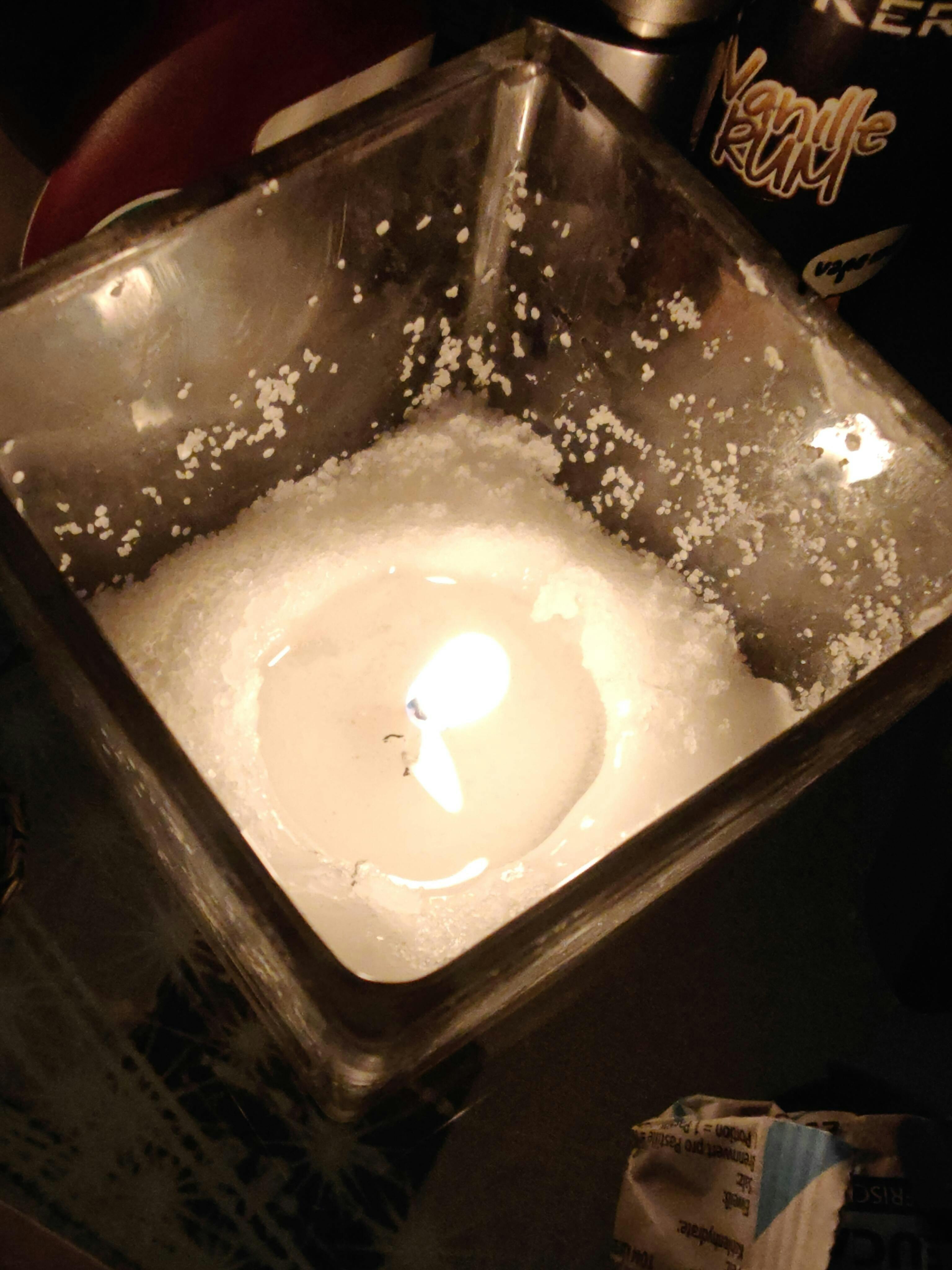 Zunächst den Docht mit Dochthalter mittig in einem leeren Gefäß oder Glas positionieren. Anschließend eine kleine Menge des geschmolzenen Kerzengranulats einfüllen und kurz abkühlen lassen, damit der Docht stabil steht. Danach das Gefäß oder Glas schichtweise mit dem Granulat befüllen und jeweils abkühlen lassen, bis die gewünschte Füllhöhe erreicht ist. Zum Schluss den Docht auf die gewünschte Länge kürzen. Die selbst hergestellte Kerze ist nun einsatzbereit.