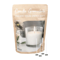 Mit diesem praktischen Set von WENZEL-Kerzen lassen sich Kerzen oder Teelichter sehr einfach selbst herstellen. Empfehlenswert ist folgende Vorgehensweise: Zunächst den Docht mit Dochthalter in der Mitte eines leeren Gefäßes oder Glases positionieren und danach etwas geschmolzenes Kerzengranulat einfüllen. Kurz abkühlen lassen, damit der Docht Stabilität erhält. Anschließend das Gefäß oder Glas schichtweise befüllen und abkühlen lassen, bis die gewünschte Füllhöhe erreicht ist. Zum Schluss den Docht auf die gewünschte Länge zuschneiden – schon ist die selbstgemachte Kerze bereit zum Anzünden. Der Name „WENZEL“ steht seit jeher für Kerzen von höchster Qualität und ansprechendem Design. Eine Verpackungseinheit enthält 1 Beutel à 400 g Kerzengranulat inkl. vier mitgelieferten Dochten und Dochthaltern. Gefäße oder Gläser zum Befüllen sind nicht im Lieferumfang enthalten.